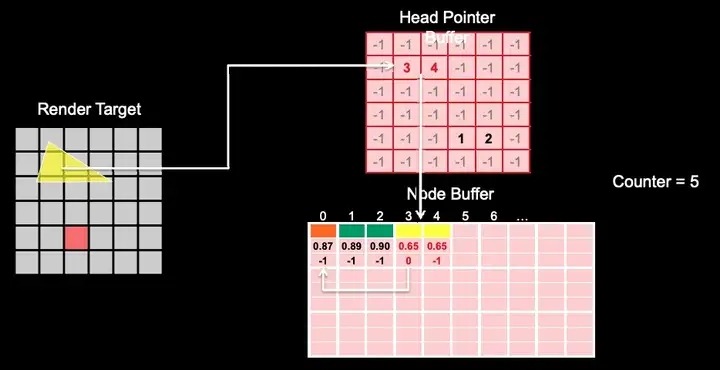 逐像素的链表,运用到了一个被称为“GPU 并行链表“的技术,在 Pixel Shader 中使用两个可写的纹理(DX11,SM5.0,UAV),一个屏幕大小的链表头纹理,一个屏幕大小 N 倍的链表节点纹理。链表头纹理的每个像素存储每个像素链表在节点纹理中的偏移量。