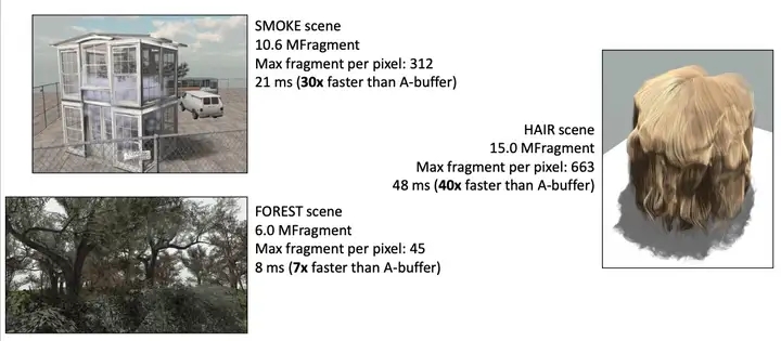 Adaptive Transparency:渲染半透明物体,建立逐像素链表,将片段颜色、深度写入对应的链表。读取 List,在本地内存空间生成近似能见度函数数组,并使用带能见度函数的混合公式混合片段计算出最终颜色。